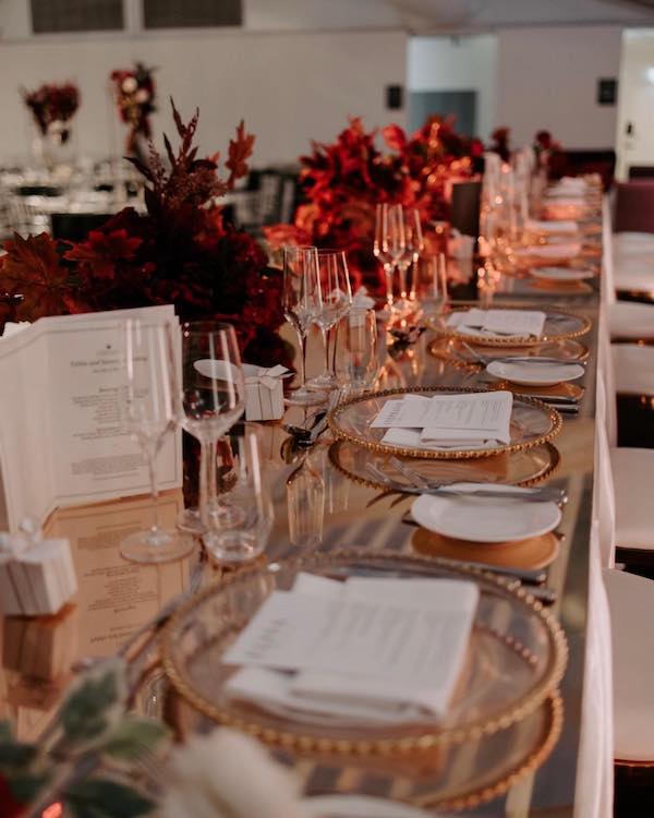 Low or tall centrepieces and a coordinated bridal table runner finish off the space to perfection.